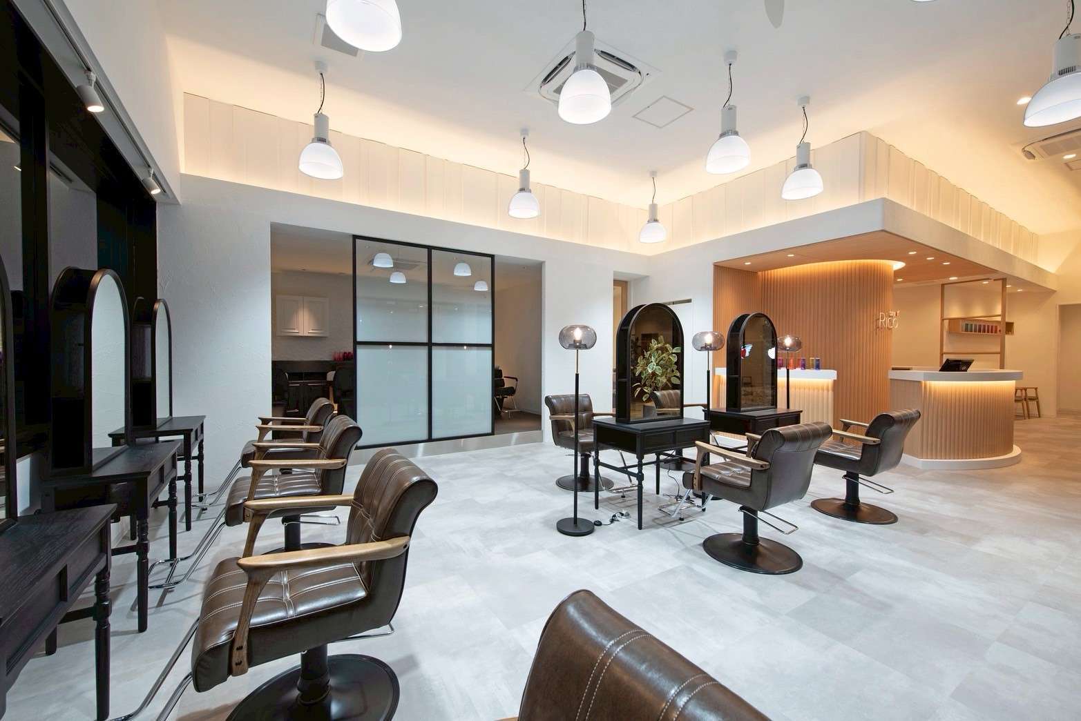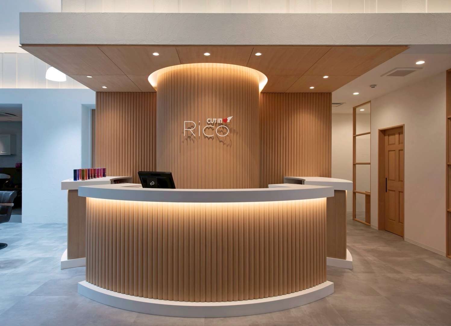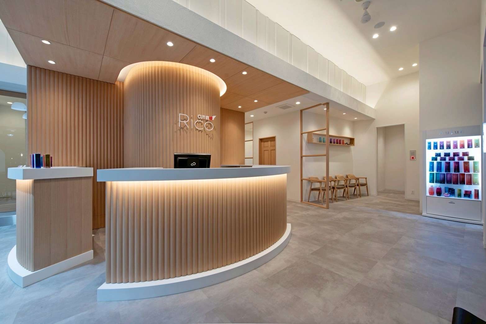 レセプションには、円形のカウンターや木素材を用い、やわらかな間接照明で包み込むことで、温かみのある印象に。店舗の顔としてインパクトと親しみやすさを両立させました。